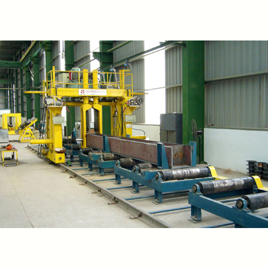 本機用于U型及箱型柱組裝,板材放在帶有輔助對中裝置的支架上,電機驅(qū)動行走門架,上、側(cè)壓缸壓緊工件的腹板和翼板組裝成型并點焊。